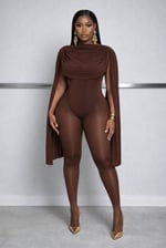 Elevate your wardrobe with a piece that demands attention. Our newest bodysuit combines a sleek, snatched silhouette with an attached dramatic cape overlay that flows effortlessly with every movement. Designed in a rich, dark colored hue, this piece features a high-neck draped bodice that exudes high-fashion elegance.