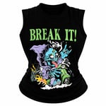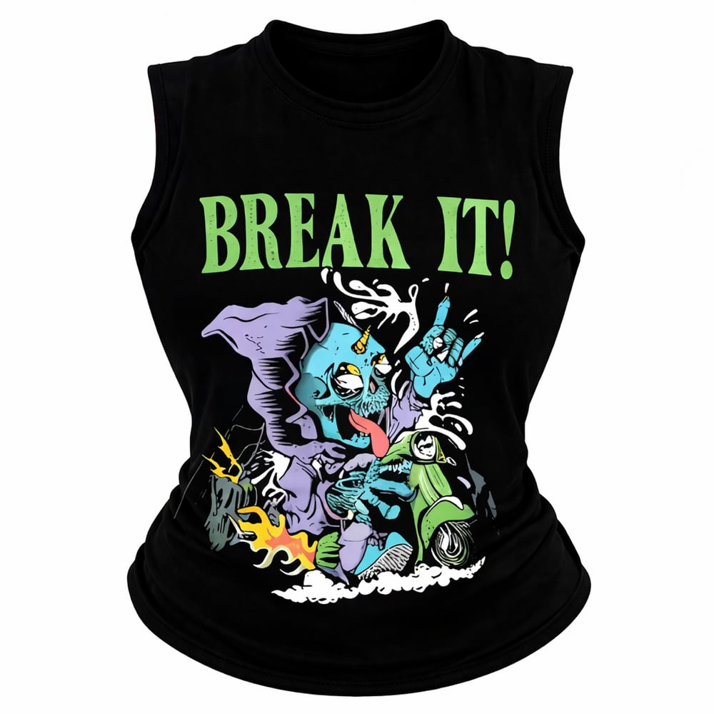 Turn heads without saying a word. This bold graphic muscle tee brings edgy energy with its eye-catching “Break It!” design and vibrant pop colors against a sleek black base. Designed with a flattering sleeveless cut that hugs in all the right places, it’s perfect for showing off your shape while keeping it effortless.
