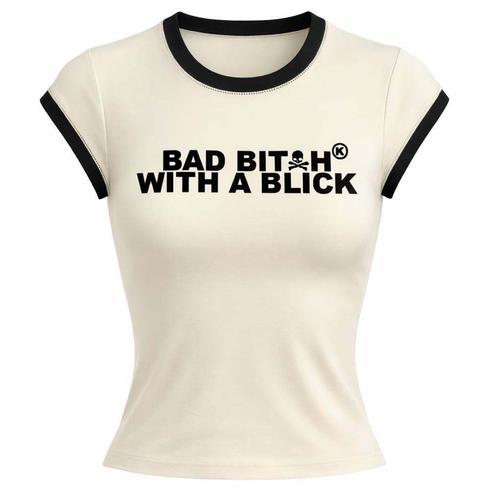 Step into your main character energy with our Bad B*tch With A Blick Crop Tee. This statement baby tee features bold graphic lettering on a soft cream base with contrast black trim for that effortless street-chic vibe. The fitted silhouette hugs your shape while the crop to full length hits perfectly at the mid-waist, making it easy to pair with cargos, denim, or your favorite statement bottoms.