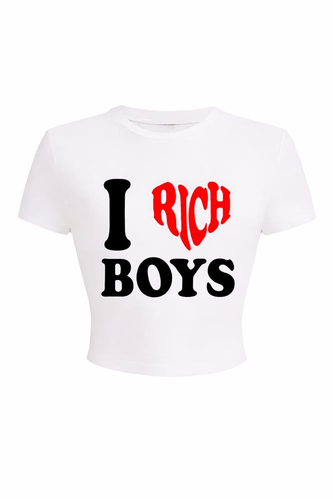 Make your standards crystal clear with this playful, Y2K-inspired graphic tee. This white crop top features a bold "I Heart Rich Boys" message with a vibrant red heart accent, delivering a mix of vintage nostalgia and modern "it-girl" confidence.