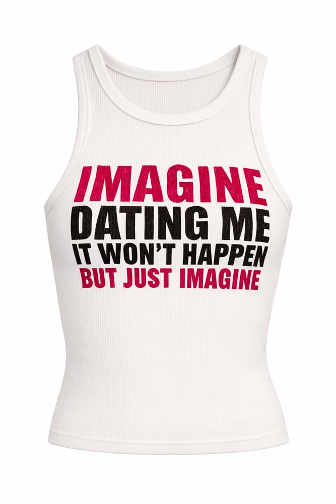 Turn heads and spark conversations with our “Just Imagine” Graphic Tank Top. Made from a soft cotton spandex blend, this tank delivers the perfect mix of comfort, stretch, and style. The bold graphic statement across the front adds a playful, confident vibe that makes it perfect for casual outings, night out with friends, or styling up with your favorite skirt or denim.