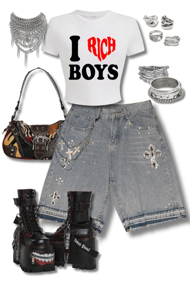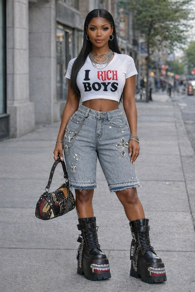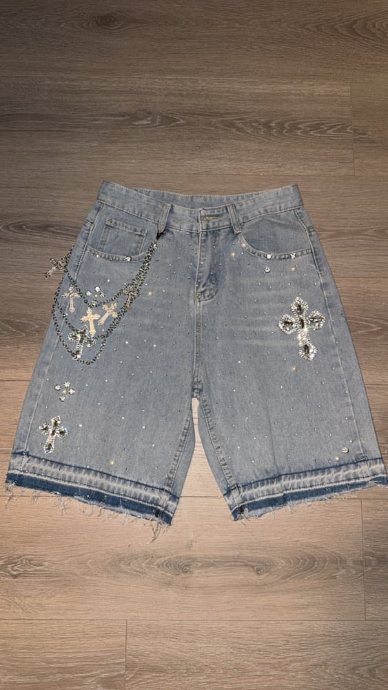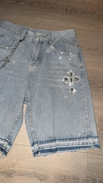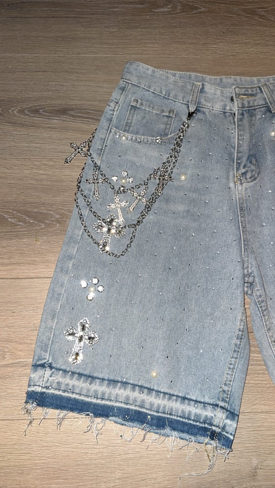 Make a statement in our Embellished Denim Chain Bermuda Shorts, designed to blend edgy detail with elevated craftsmanship. Cut from premium light-wash denim, these shorts feature intricate rhinestone and pearl embellishments scattered throughout for a subtle sparkle. Signature crystal cross appliqués add a bold focal point, while detachable layered silver chain detailing drapes effortlessly from the waistband for a luxe, fashion-forward finish.
