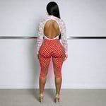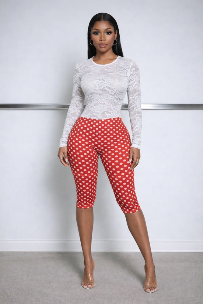 The top features an intricate white floral lace with long sleeves and a sophisticated high neckline, offering a sheer, textured look. The bodice transitions with a dynamic asymmetrical waistline into high-stretch, vibrant red leggingsadorned with crisp white polka dots. With a figure-hugging fit and a cropped Capri length, this romper is designed to move with you while maintaining a sharp, high-contrast silhouette.