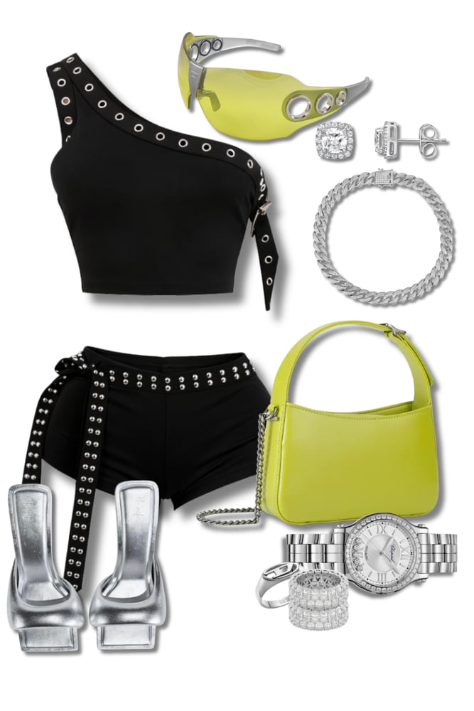 Make a statement in this high-energy two-piece set. Featuring a unique one-shoulder crop top and matching high-waisted mini shorts, this outfit is defined by its industrial-inspired silver grommet hardware. The top includes a diagonal strap and buckle detailing, while the shorts feature a long, dramatic grommet belt that adds movement and a "baddie" aesthetic to your look.